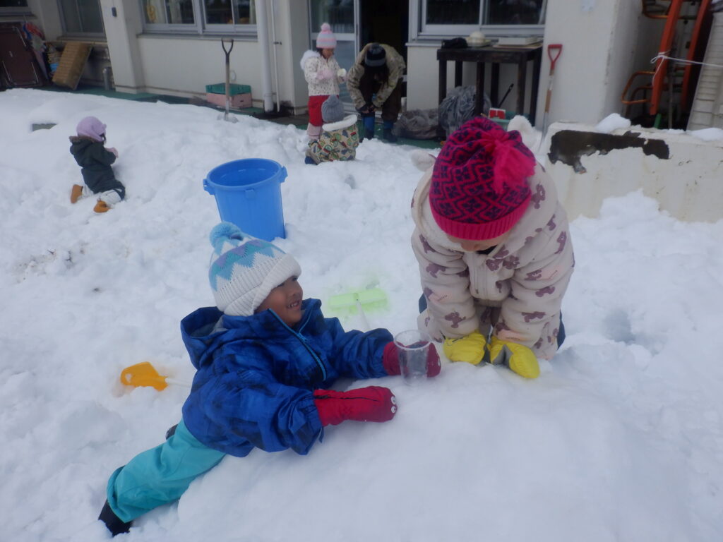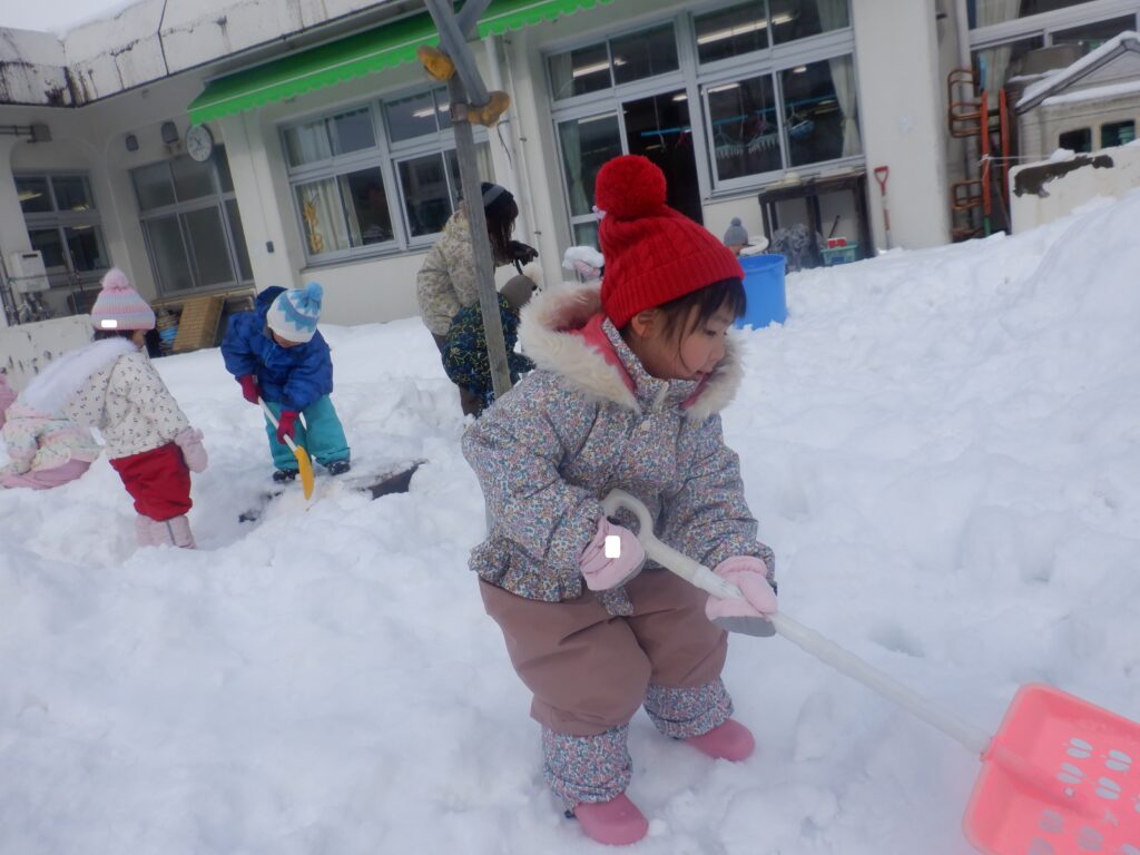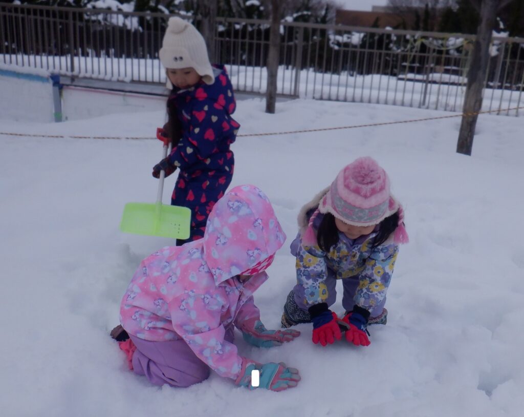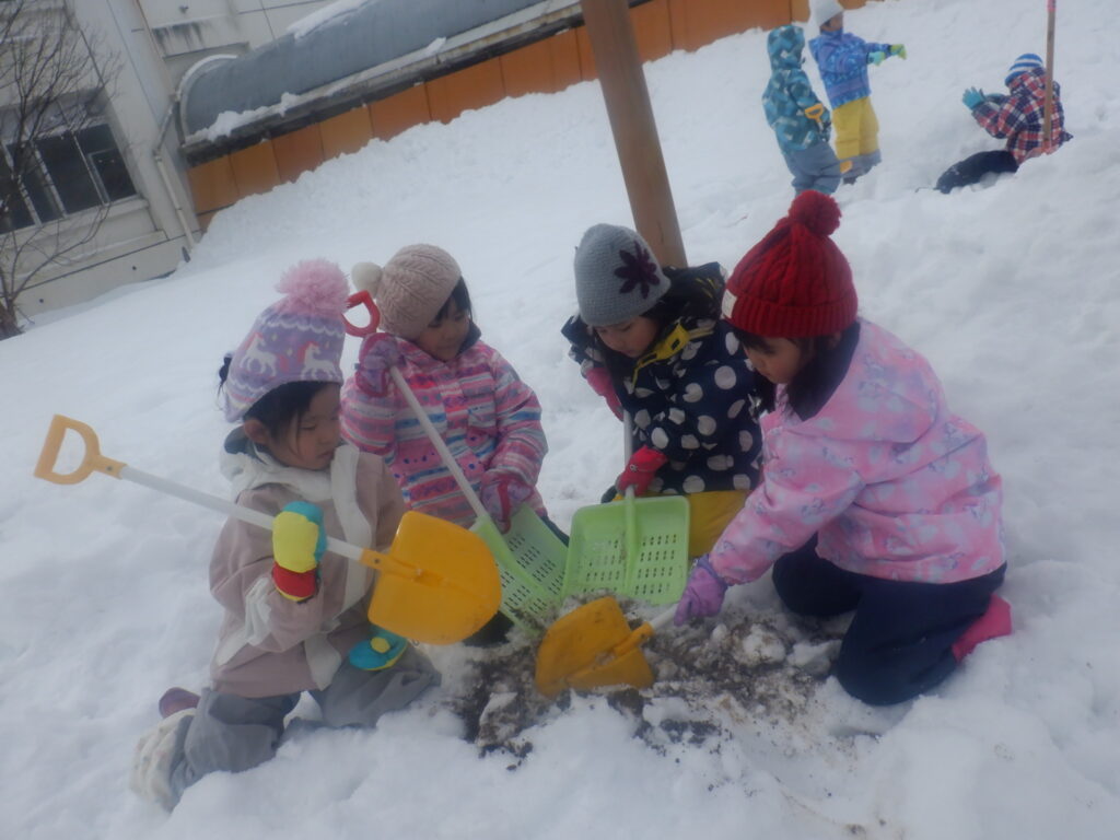 さくら組のお友達は,スコップで雪をすくったり,どんぐりやカリンを雪に埋めたりしています。