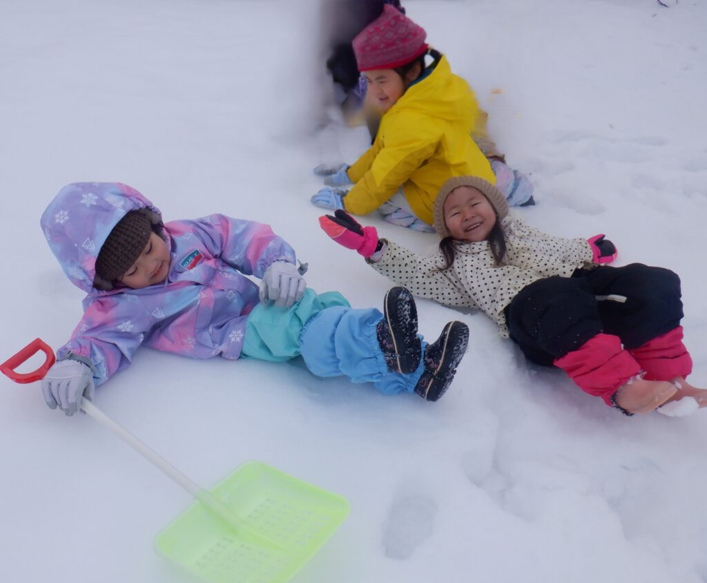 ばら組のお友達は,全身で雪を感じながら,柔らかい雪の上に寝転んでいます。