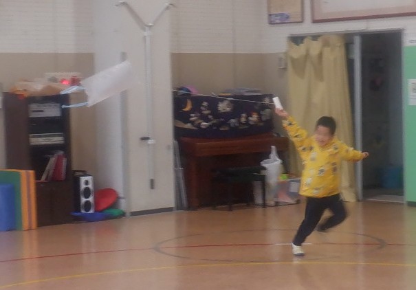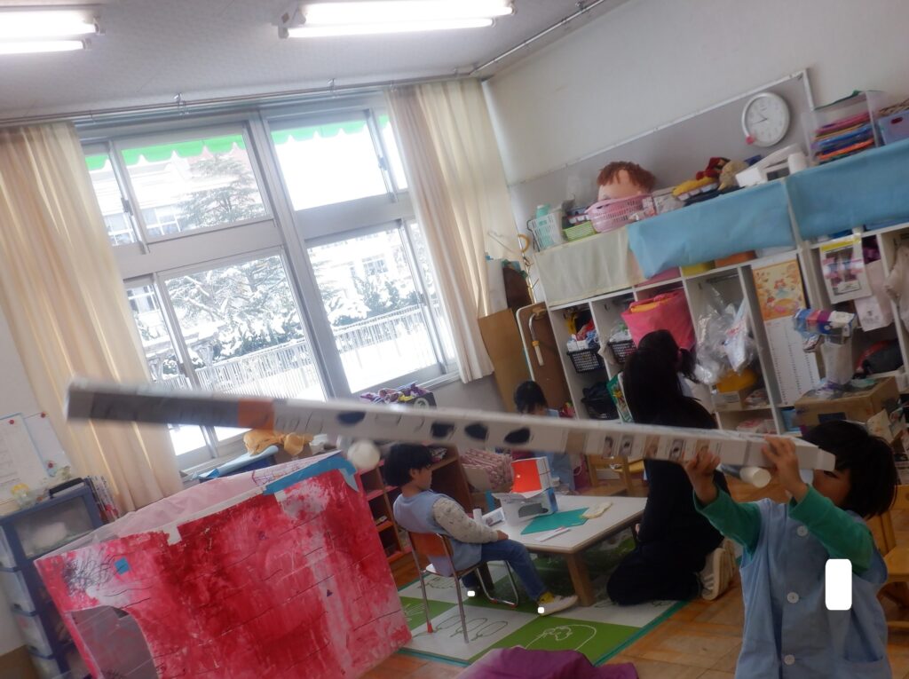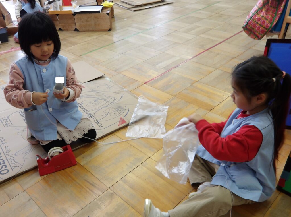 もり組のお友達は,ビニル袋とペーパー芯,スズランテープを組み合わせて,凧を作りました。遊戯室で凧揚げをしています。