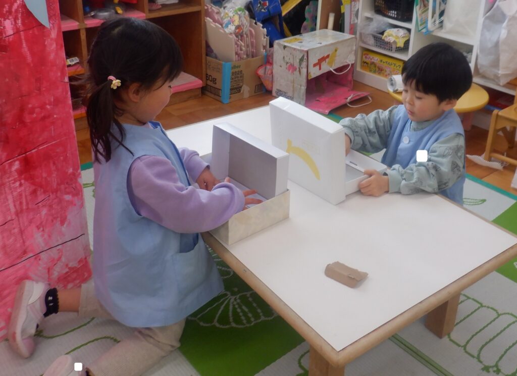 さくら組のお友達は,お医者さんになりきって,患者さんの症状について空き箱で作ったパソコンで調べています。