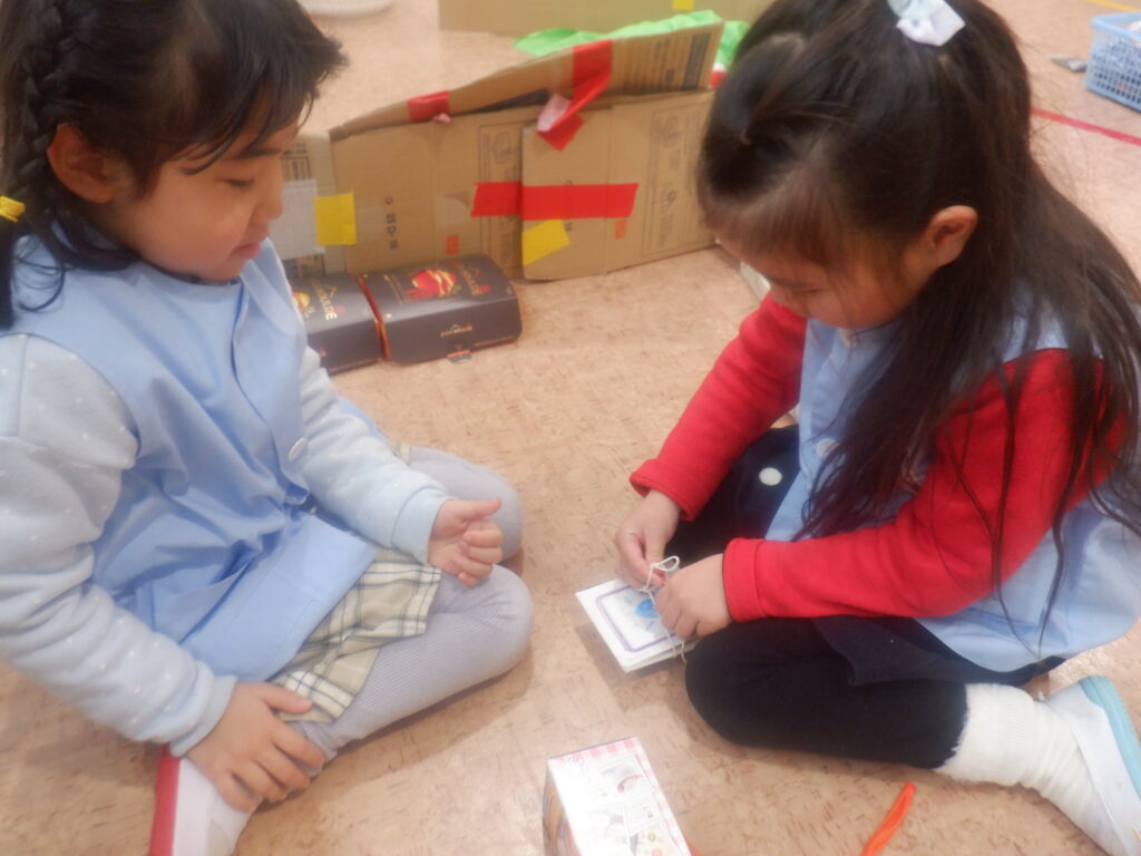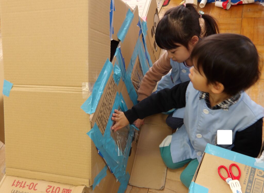 さくら組のお友達は,昨日作った長い車の側面を切り取って,たくさんの窓をつけ,先端から覗いています。