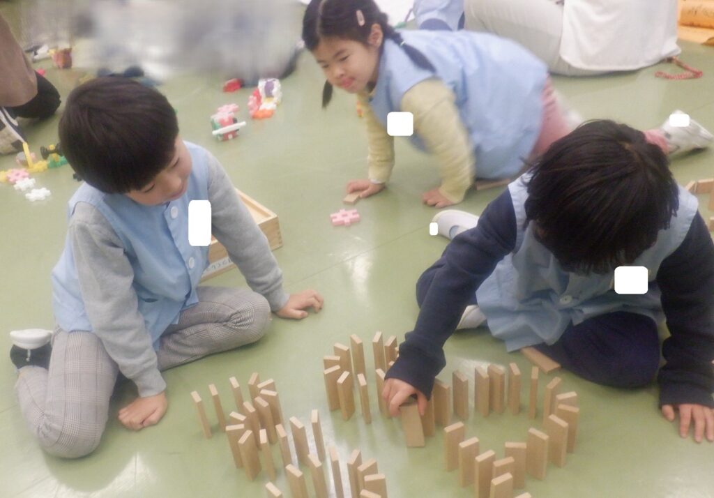 無限積み木を崩れないように慎重に積み上げたり,床に並べたりしています。