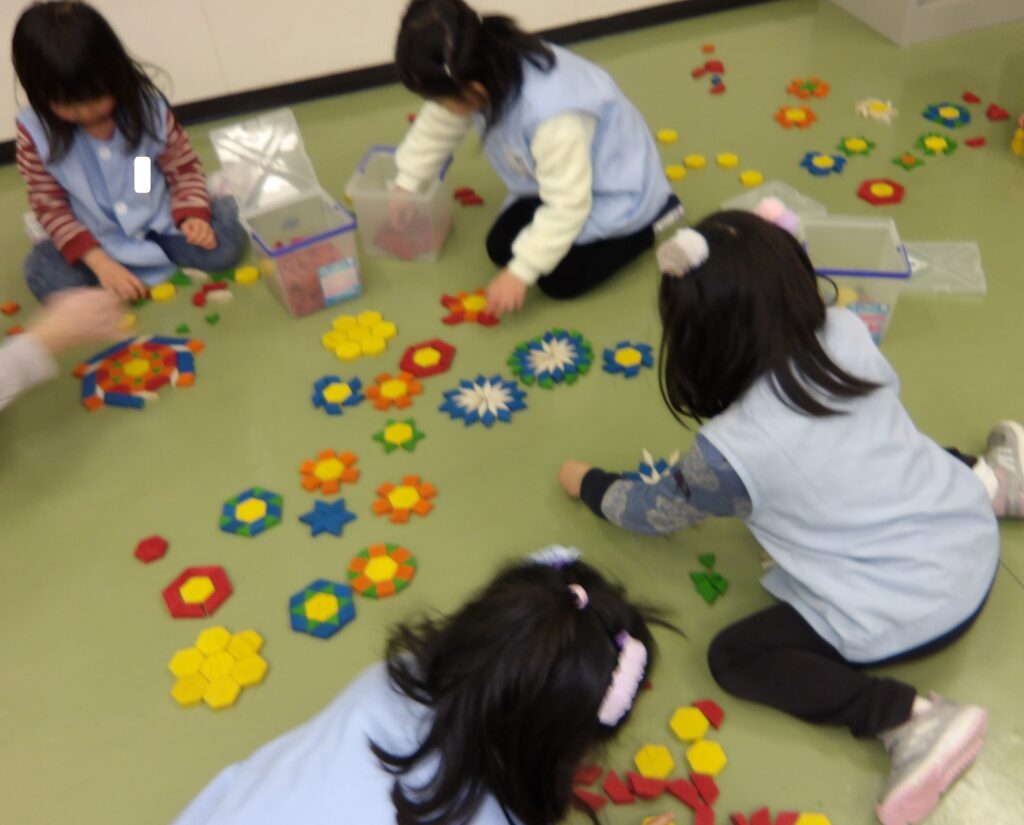 パターンブロックの色や形の組み合わせを考えながら,お花や素敵な模様を作っています。
