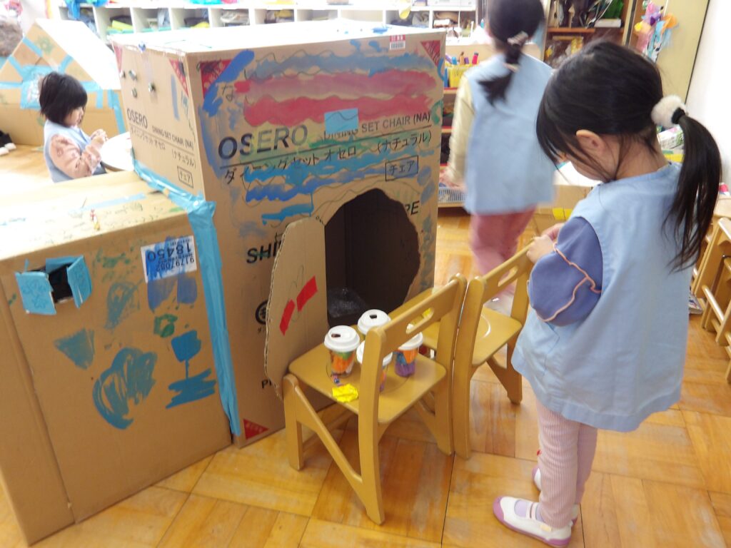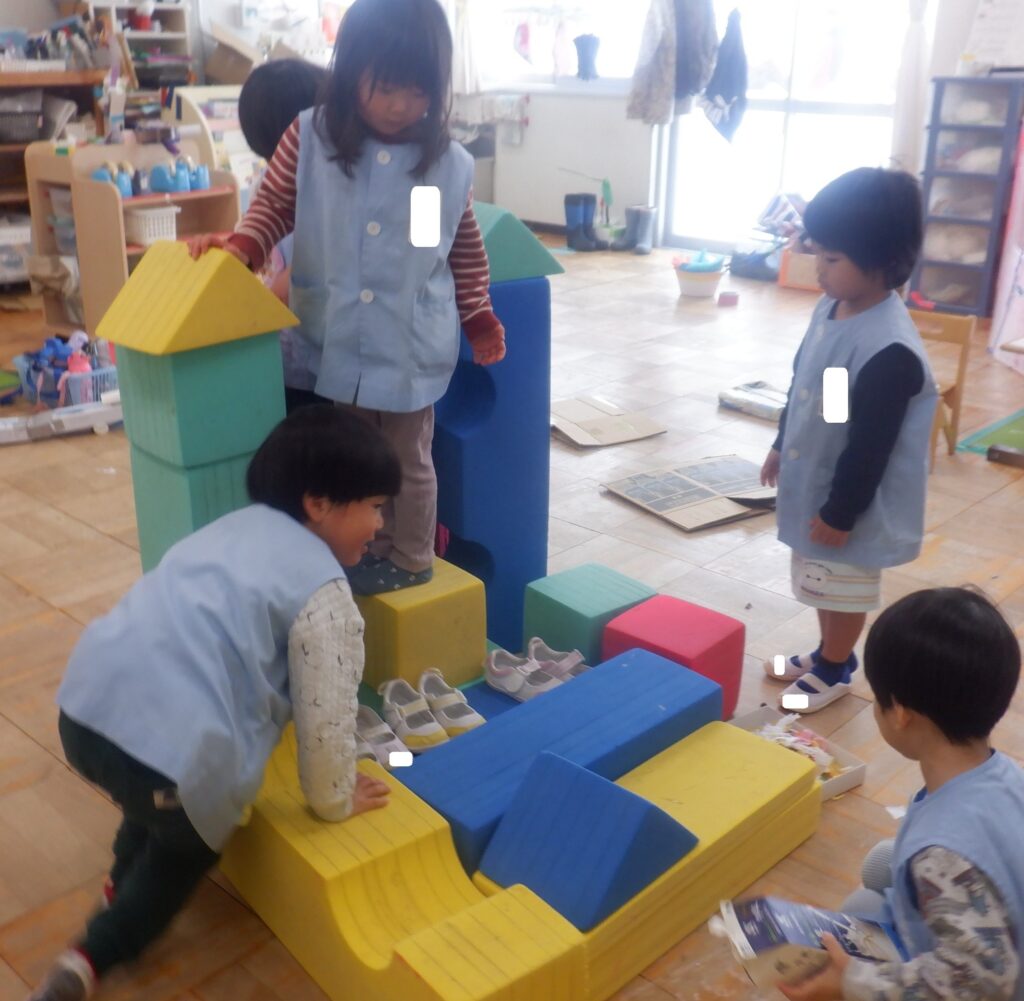 さくら組のお友達は,ソフトブロックを並べて,犬・猫のお家を作りました。犬や猫になりきって,お家の中を歩き回っています。