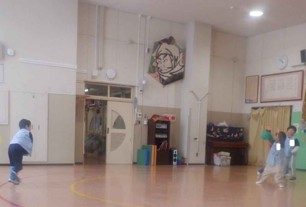 もり組のお友達は,新聞紙を丸めてガムテープを貼り,ボールを作りました。みんなでルールを決めて,アメリカンドッヂという遊びをしています。