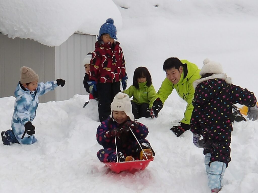 ばら組のお友達は,なかよし広場でそり遊びをしました。転倒しないようにバランスを取りながら、ひもをしっかり握っています。
