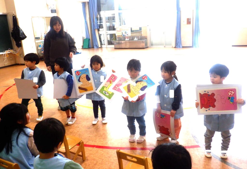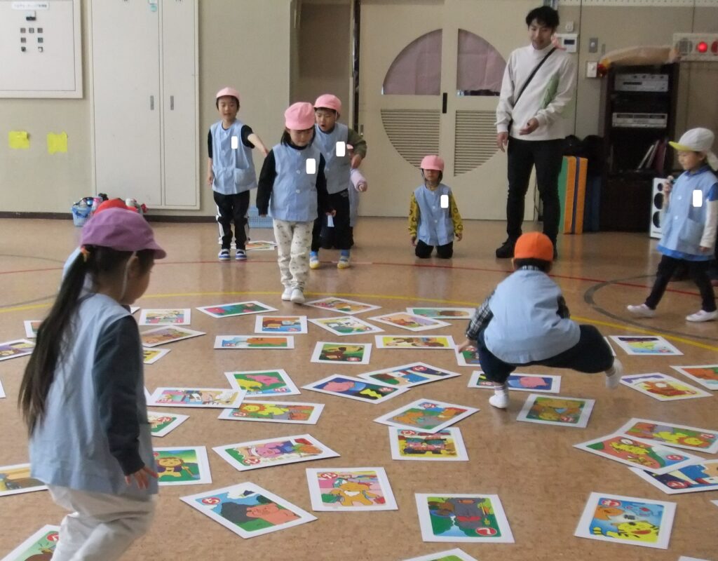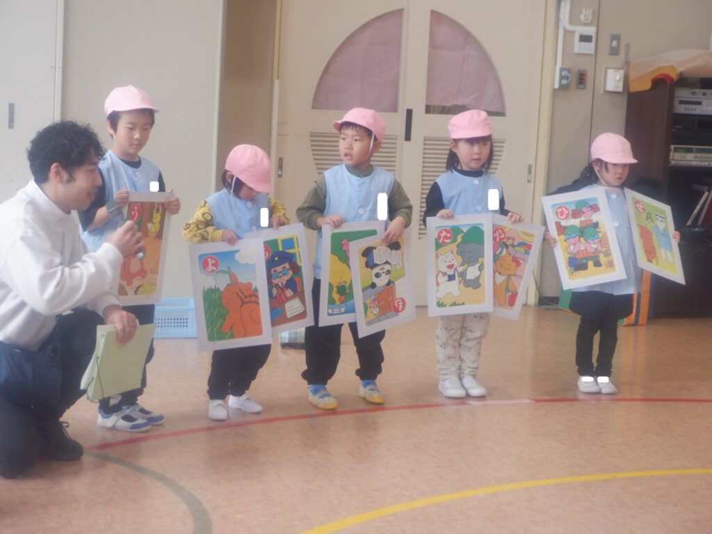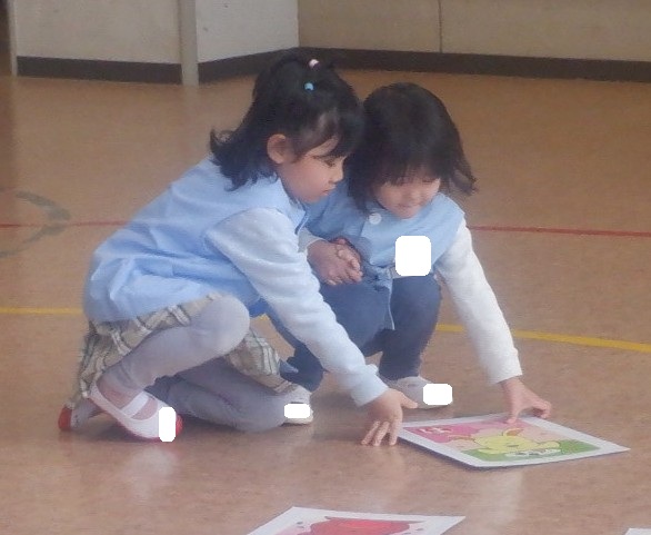 今日は,ジャンボかるた大会がありました。前半は,もり組とばら組のお友達が,なかよし班で順番にかるたをとりました。後半は,さくら組ともり組が手をつないで,かるたをとりました。