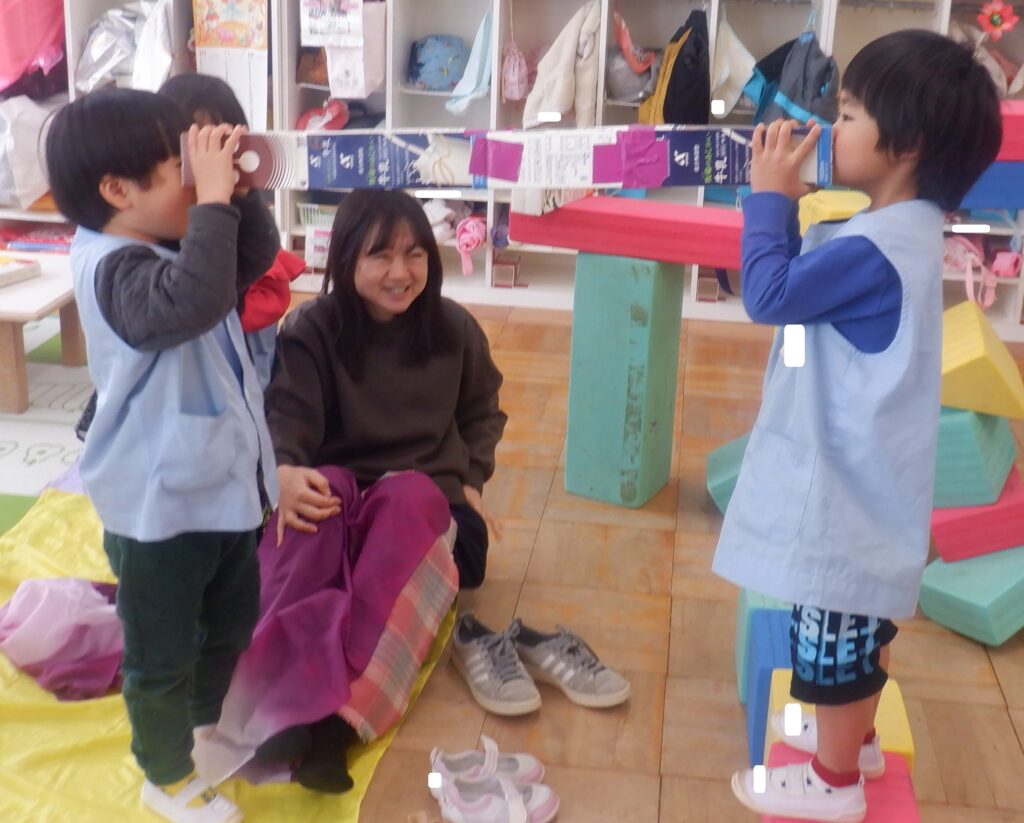 さくら組のお友達は,覗けるように牛乳パックの底を切り取ったものを何個もつなぎ合わせて,長い望遠鏡を作りました。