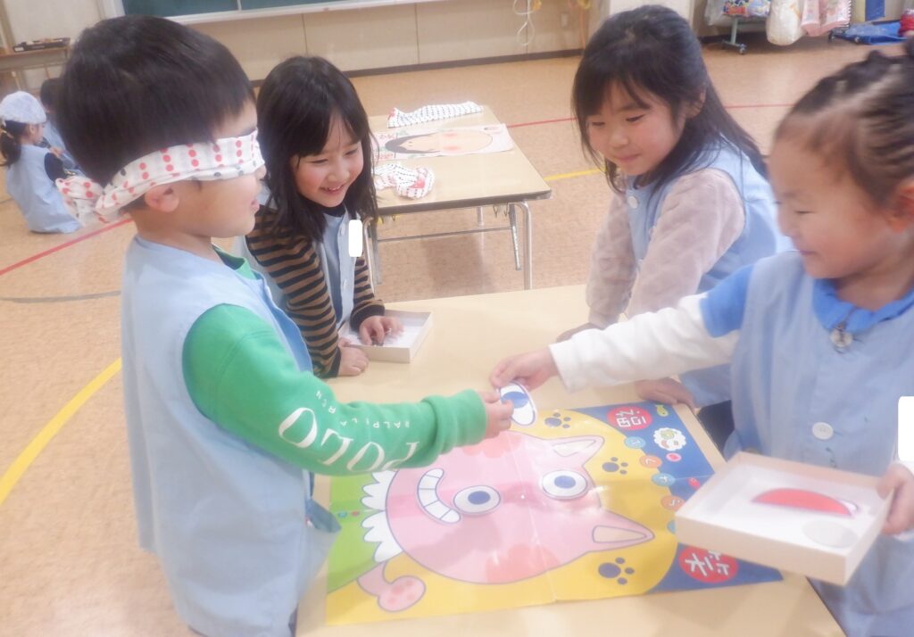 ばら組ともり組のお友達は,なかよし班でだるま落としや福笑いで遊んでいます。グループでやりたい遊びを選んでみんなで順番に遊びます。