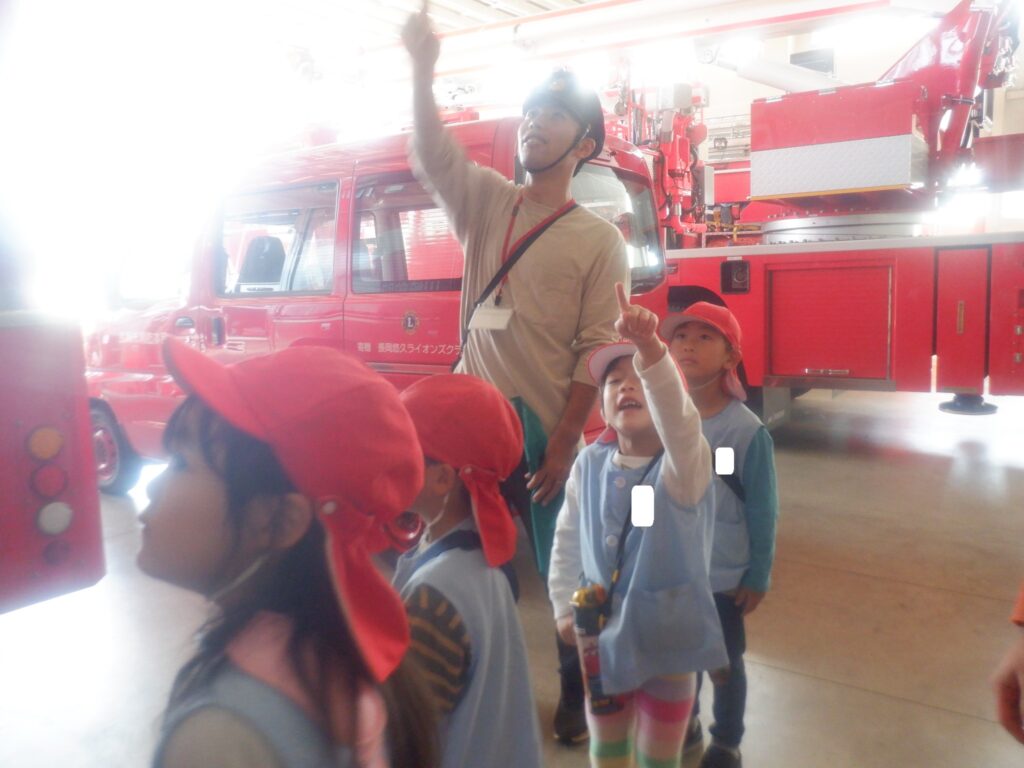もり組のお友達は,建物や道路,標識などを見ながら,お散歩に出かけました。消防署の前に行くと,ちょうど消防士さんが出てきて,車庫の中を見せてくれました。