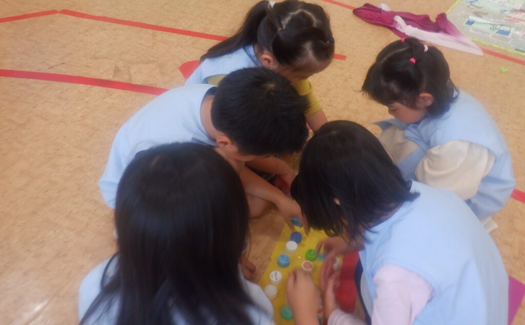 「ペットボトルの ふたを ならべて つくっていこう」