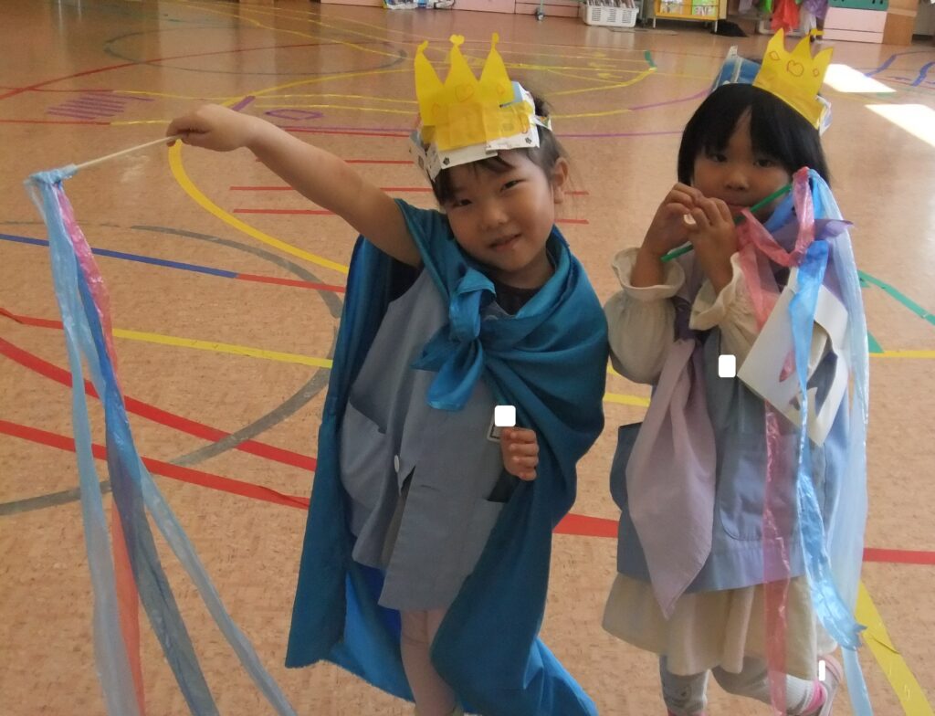 ばら組のお友達は,形や色をイメージしながら王冠を作ったり,衣装を身に着けたりしてプリンセスになっています。