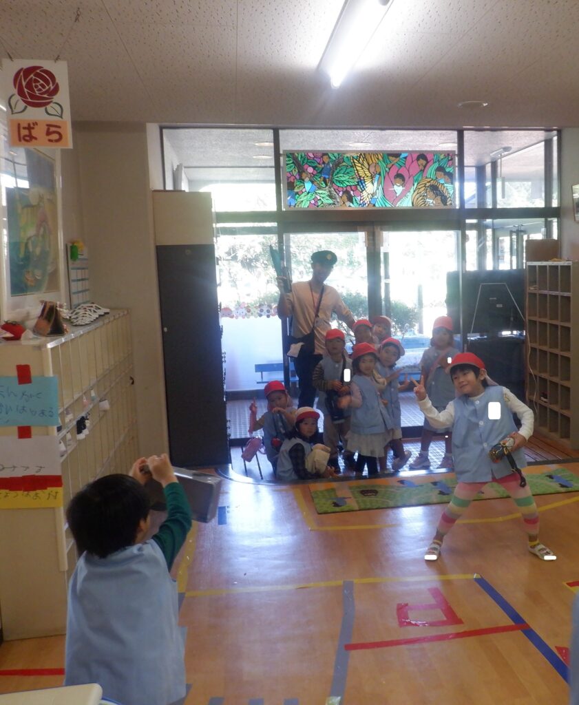 さくら組のお友達は,空き箱で作ったカメラで,カメラマンになりきって写真を撮っています。