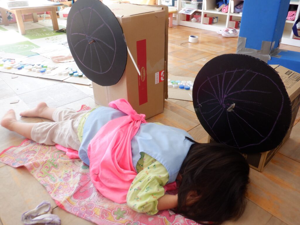 さくら組のお友達は,黒いプラ板にクレヨンで車輪を描いて,ダンボールに取り付けて糸車を作りました。