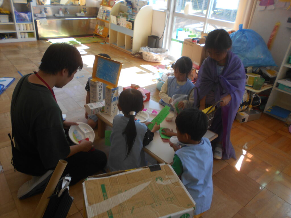 ばら組のお友達は,素材を組み合わせてアイスを作り,アイス屋さんを開いています。お客さんにわかりやすいように看板を作りました。