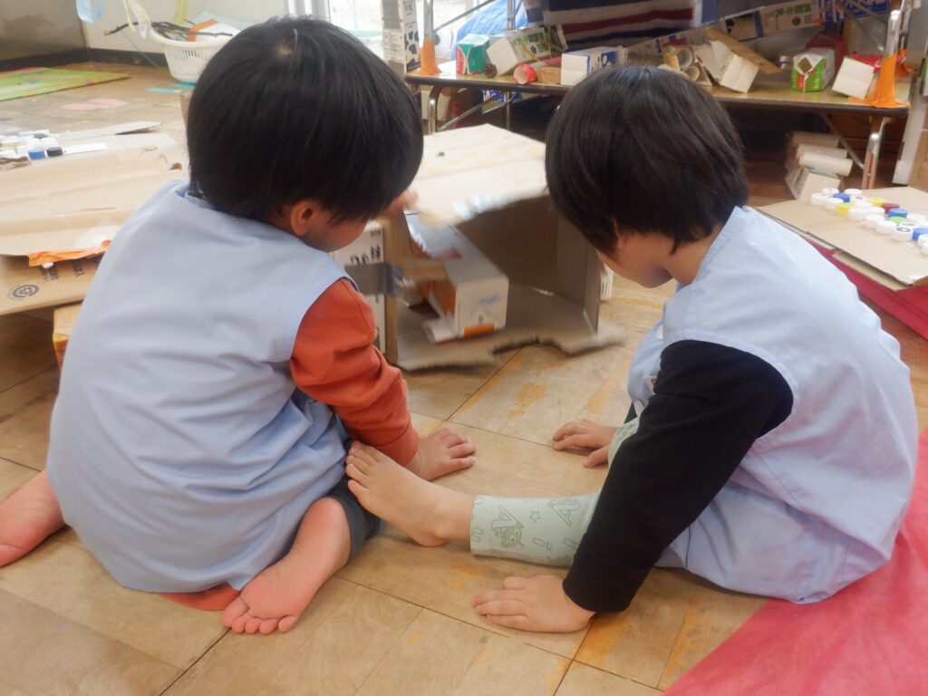さくら組のお友達は,ダンボール箱で作った洗車機に車を入れて洗っています。