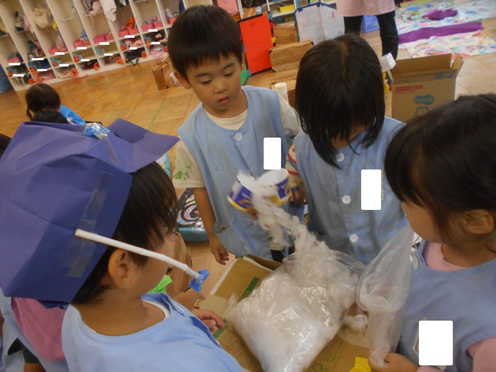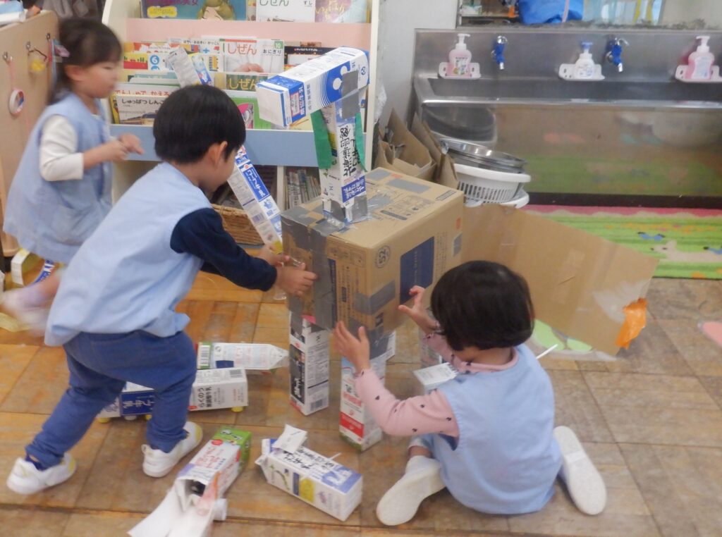 さくら組のお友達は,絵本の中に出てくる王子様が乗ってきた馬を作りたいと思い,ダンボールや牛乳パックを組み合わせて作っています。