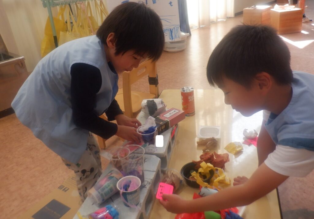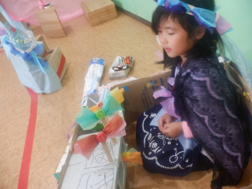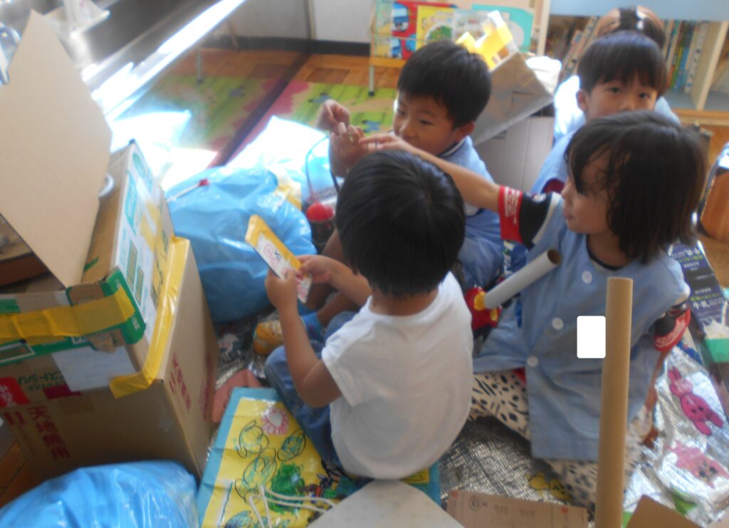 もり組のお友達は,色の組み合わせを考えながら,お花紙とペットボトルの蓋でキャンディーを作って売っています。