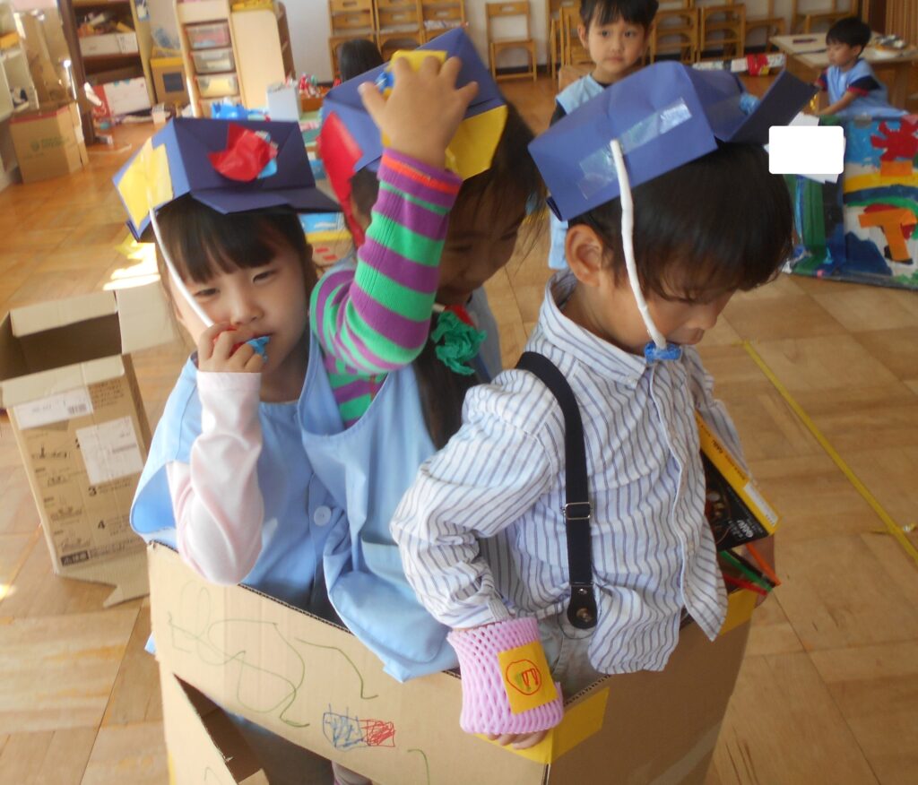 ばら組のお友達は,お巡りさんの帽子をかぶり,パトカーに乗ってパトロールに出かけています。