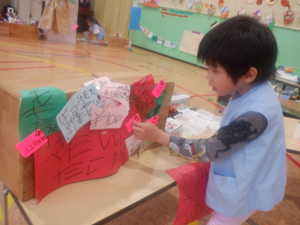 もり組のお友達は,まちの道路沿いにたこ焼き屋をオープンしました。お客さんにわかりやすいような看板や値札作りをしています。