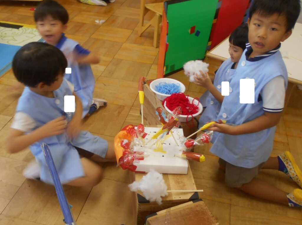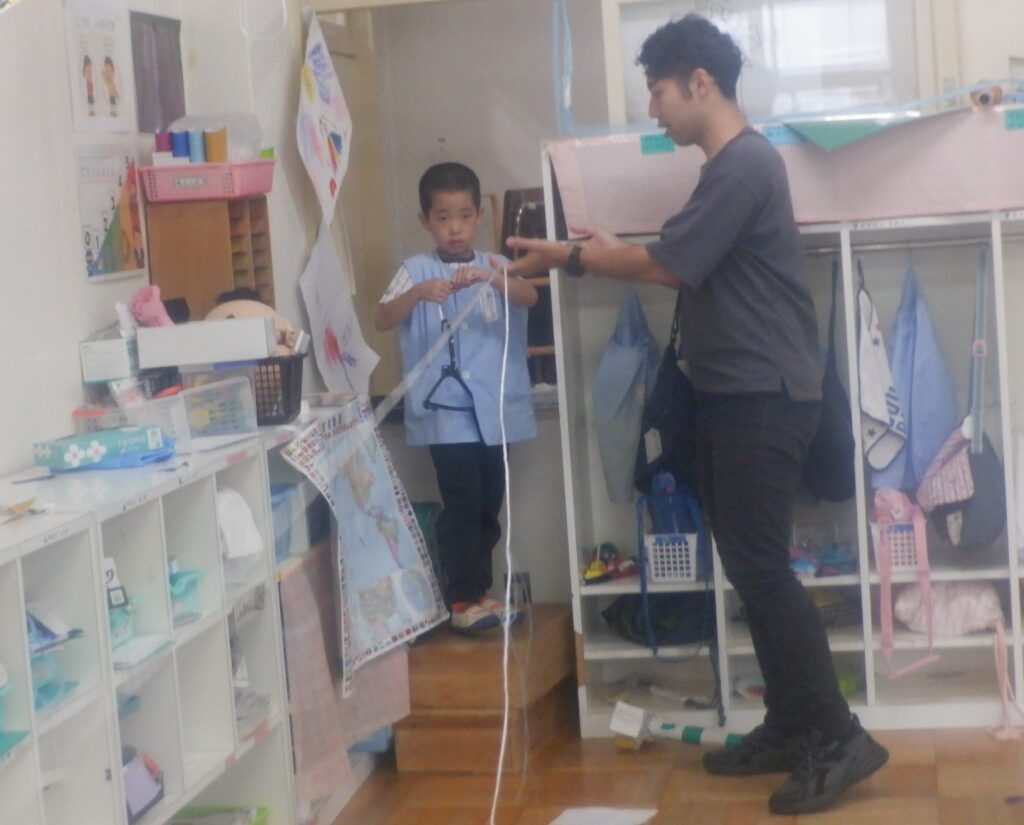 もり組のお友達は,友達のところまで自動でものを届けようと,紐の角度や仕組みを自分なりに考えて何度も試しています。