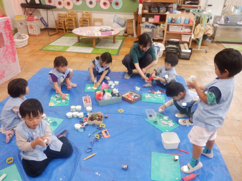 さくら組のお友達は,紙粘土の感触を楽しみながら,お団子やハンバーグなどを作っています。