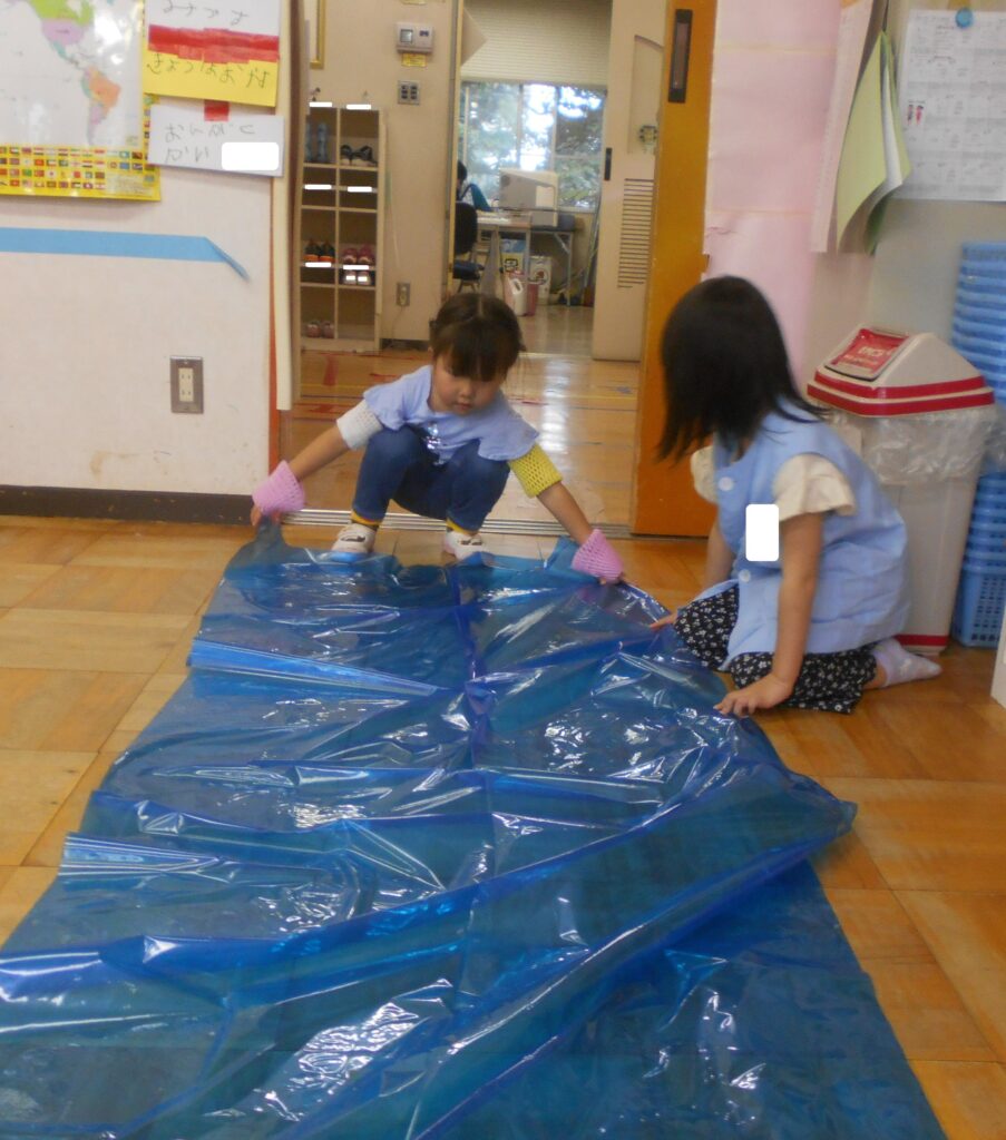 ばら組のお友達は,海を作りたいと思い,お友達と一緒に青いビニルシートを広げています。