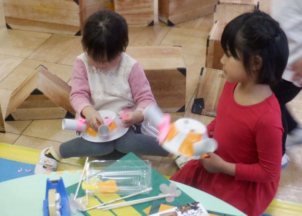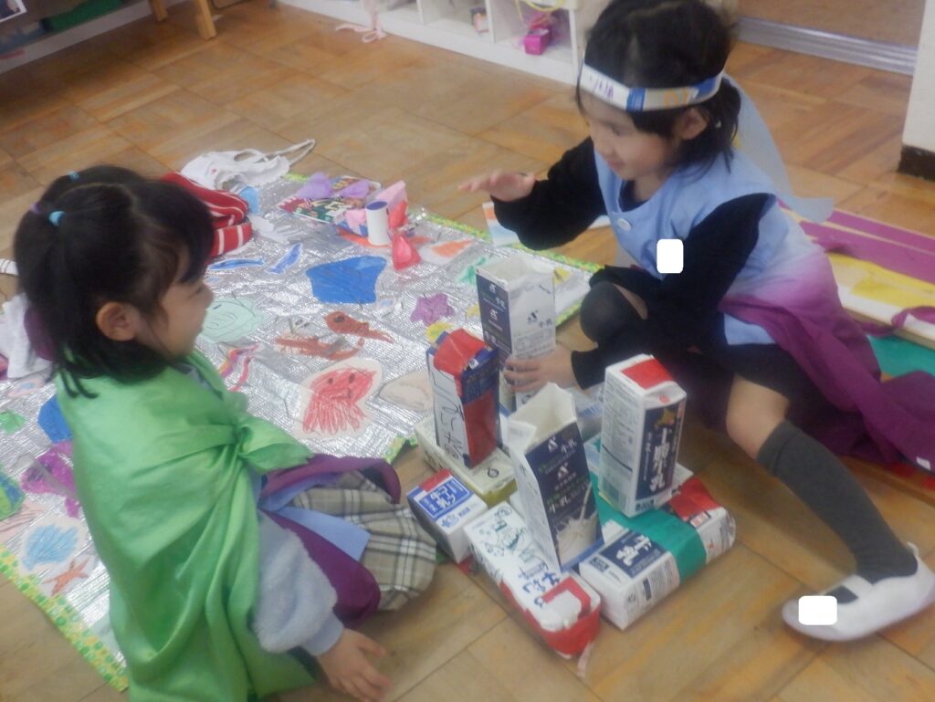 もり組のお友達は,おしゃべりしながらイメージを共有し,牛乳パックでテーブルを作っています。
