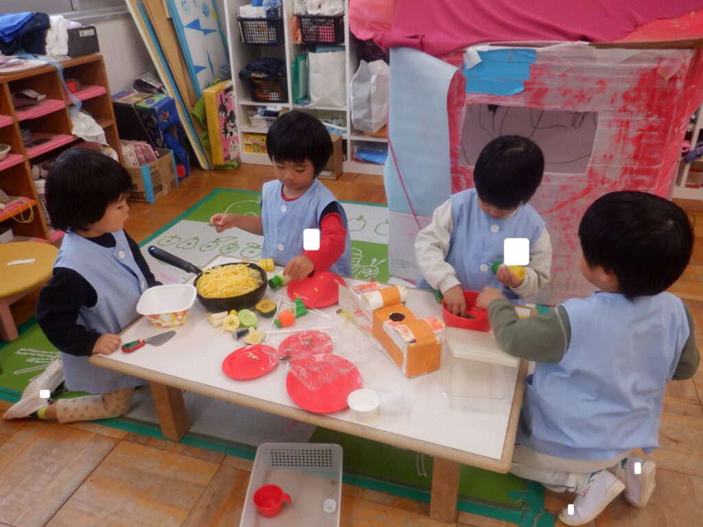 さくら組のお友達は,フライパンいっぱいにラーメンを作ったり,お弁当箱にドングリを詰めたりしています。