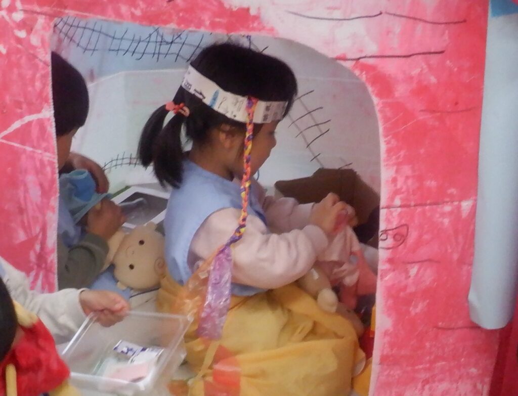さくら組のお友達は,赤ちゃんをおんぶしたり,お風呂に入れたりしています。