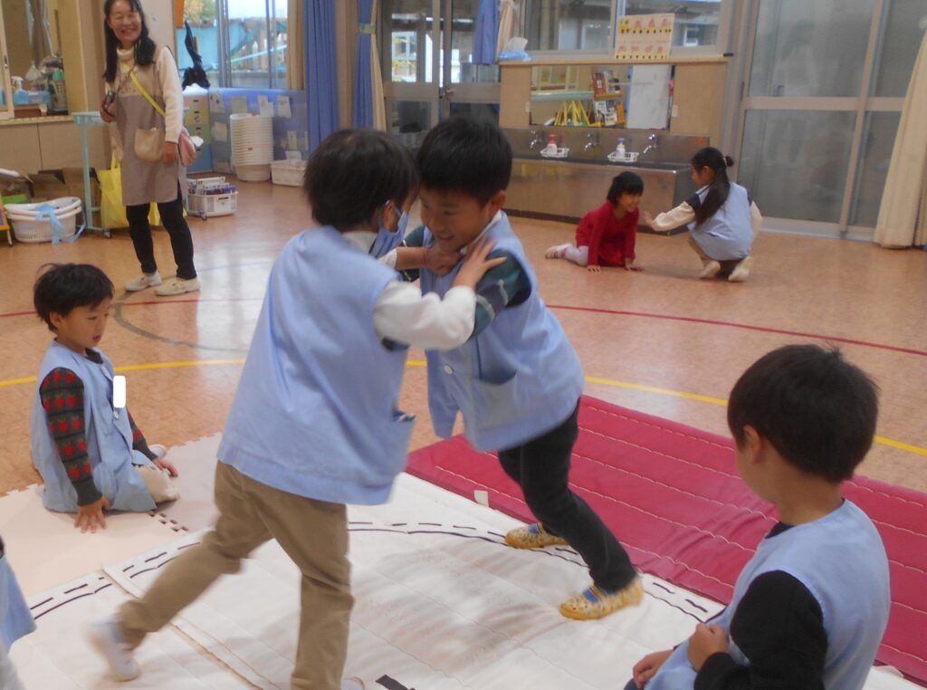 ばら組のお友達は,土俵の上に倒れないようにしっかりと足腰に力を入れて,おすもうをとっています。