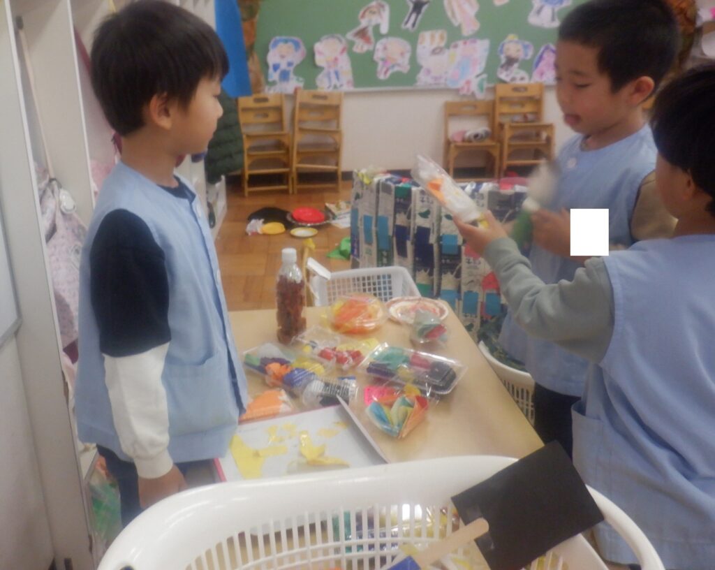 もり組のお友達は,お弁当屋さんを開きました。お客さんに買いたいものを必要なものを聞いて作った商品を店に並べ,売っています。
