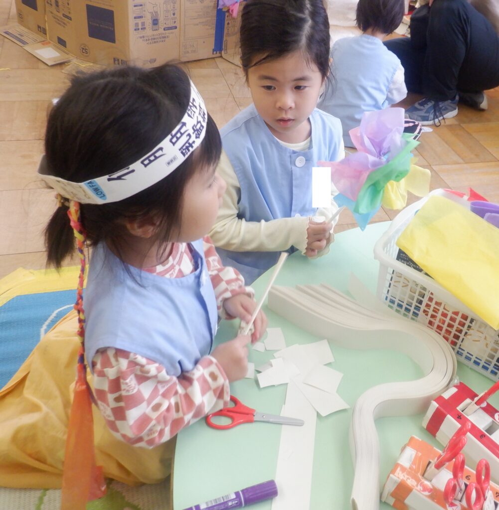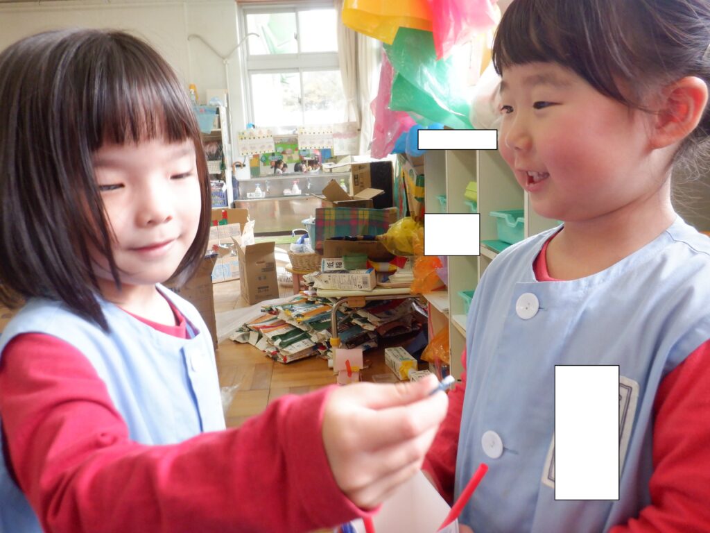さくら組とばら組のお友達は,くじ引きを作りました。あたりが出るとお互いににっこりし,一緒に喜び合っています。