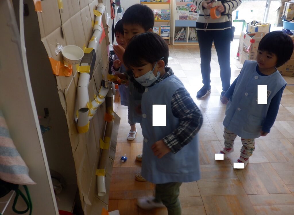 さくら組とばら組のお友達は,どんぐりが転がるコースを作りました。ゴールまで転がるようにコースに使う素材やペーパー芯の向きを工夫しています。