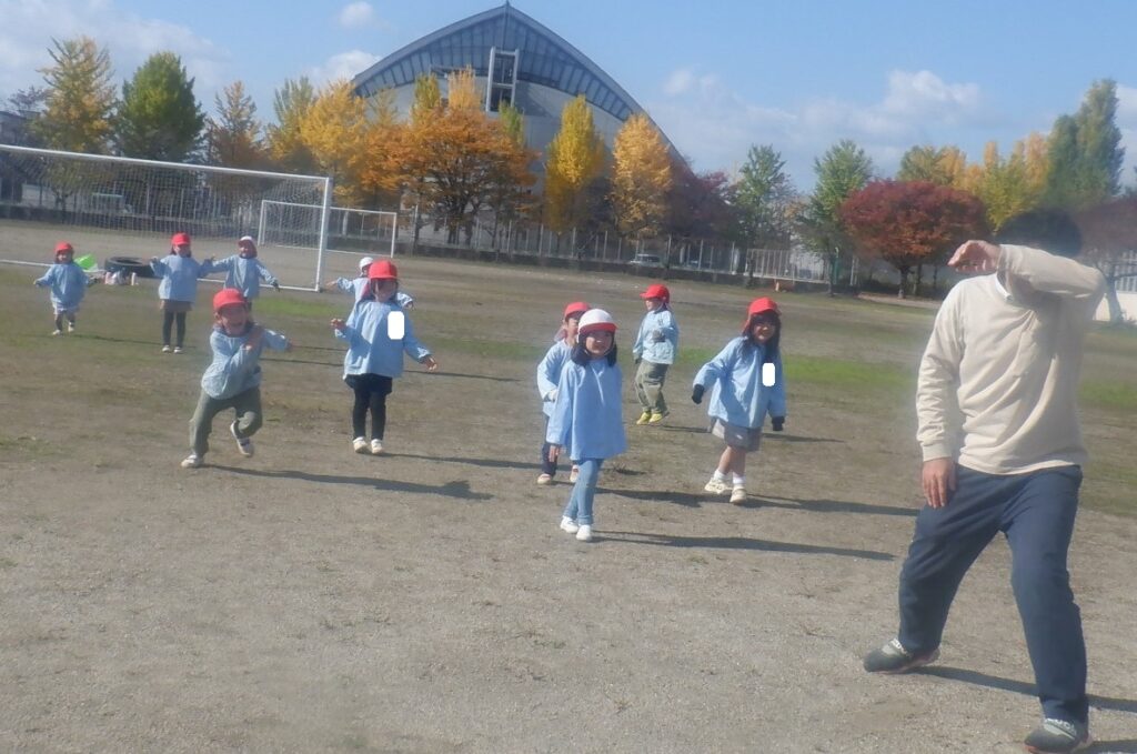 もり組のお友達は,中学校のグラウンドへ散歩に出かけました。秋の空気を感じながらみんなで体を動かします。