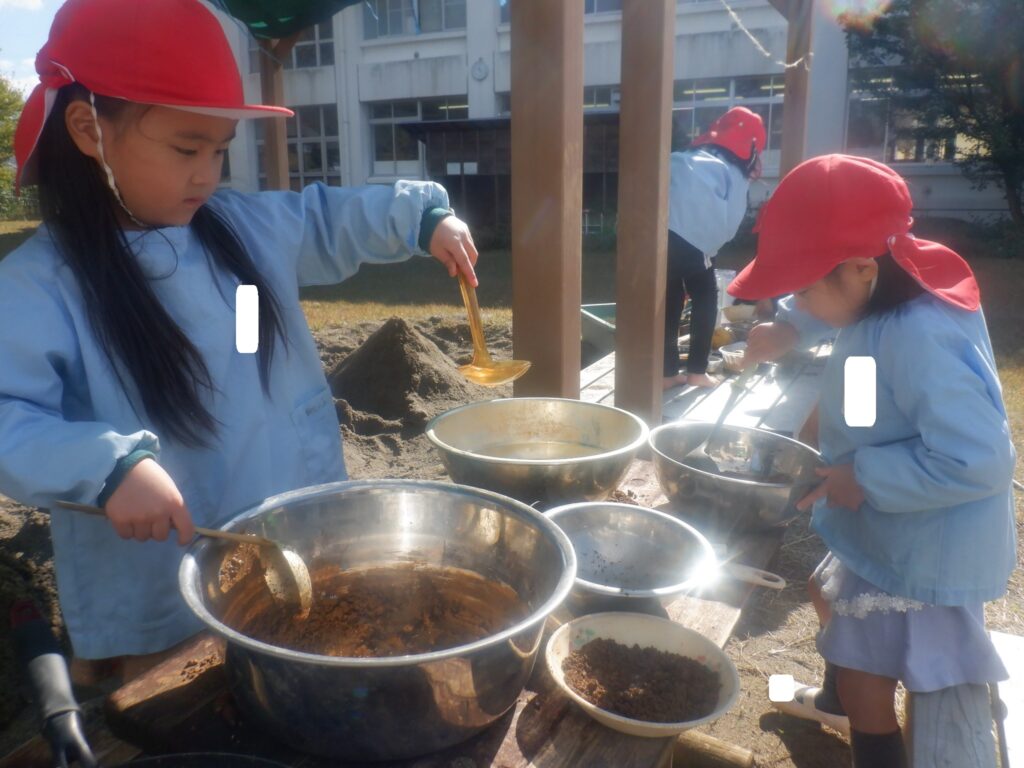 もり組のお友達は,お散歩で拾ってきた木の実やきれいな色の落ち葉を使って料理をしています。