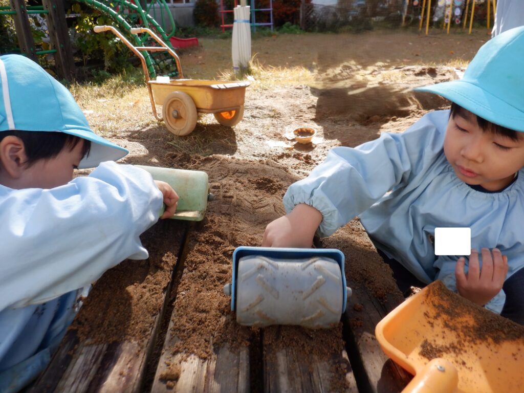 さくら組のお友達は,ベンチの上に土をのせて,土の感触を味わいながらローラーで土を平らに伸ばしています。