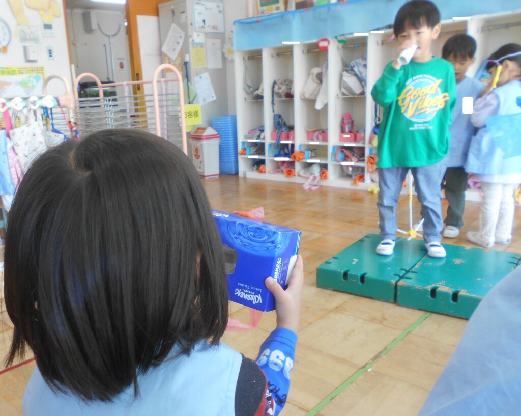 ばら組のお友達は,手作りのカメラを持って,ステージで歌っているアイドルの写真を撮っています。