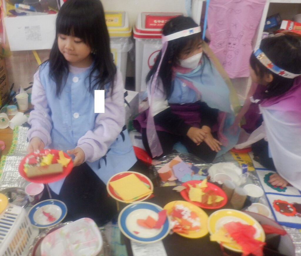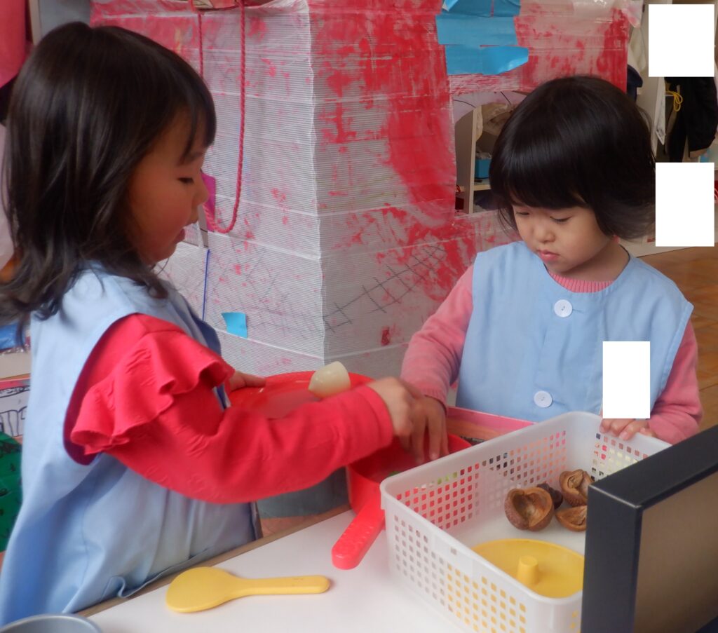 さくら組のお友達は,秋の自然物を使って,友達と一緒に料理をしています。