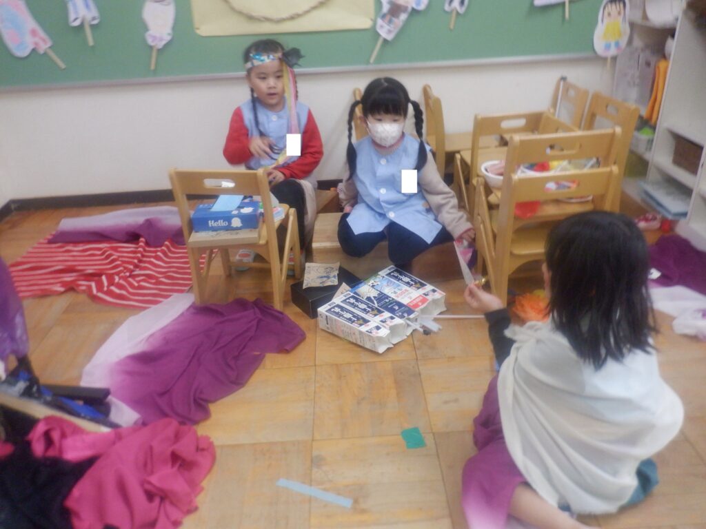 もり組のお友達は,積み木やいすを並べて家を作りました。家に届いたラーメンやピザを,一緒に食べています。