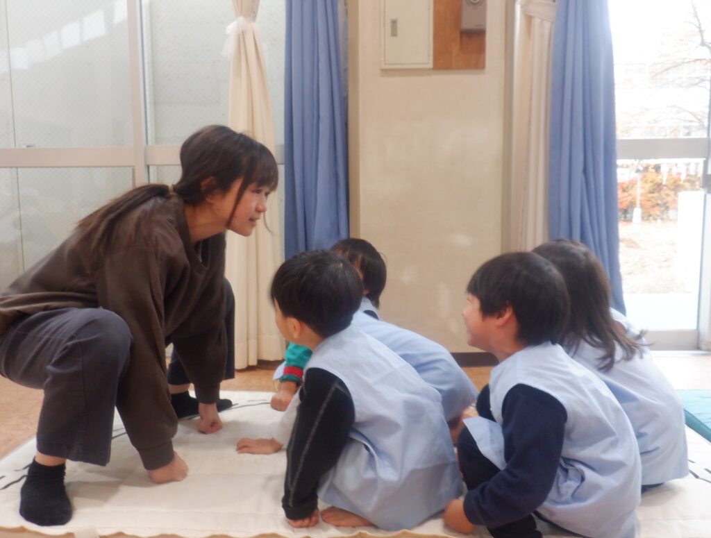 さくら組のお友達は,以前もり組のお友達に招待してもらった相撲大会で見た時のことを思い出しながら相撲をとっています。