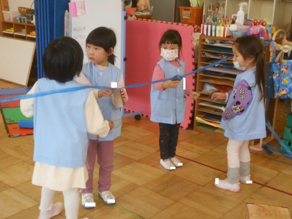 ばら組のお友達は,ひもに通せばロープウェイが動かすことができると気付き,保育室の端から端まで動かしています。