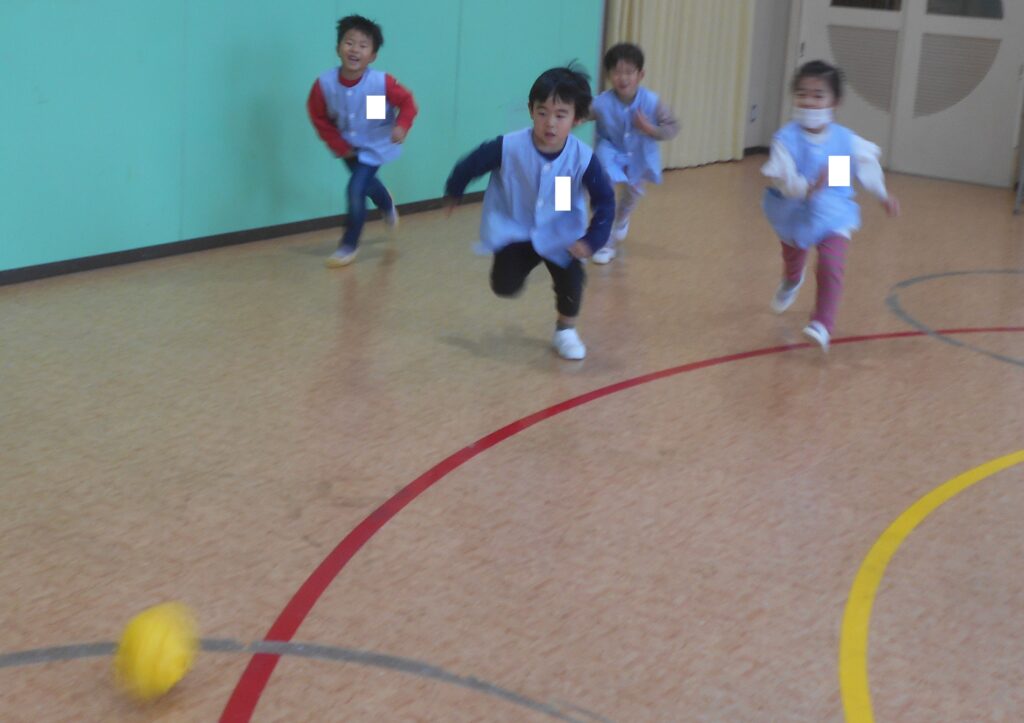 ばら組のお友達は,作ったボールを蹴ったり投げたりし,友達と一緒に身体を動かす心地よさを味わいました。