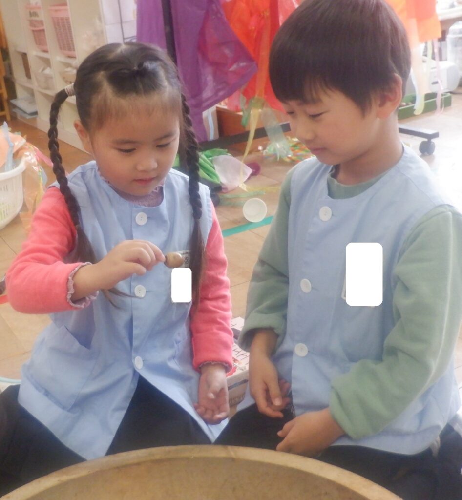 もり組のお友達は,自分で作ったコマの中から形や重さ,軸の長さなどを見て,よく回りそうなコマを選んでいます。