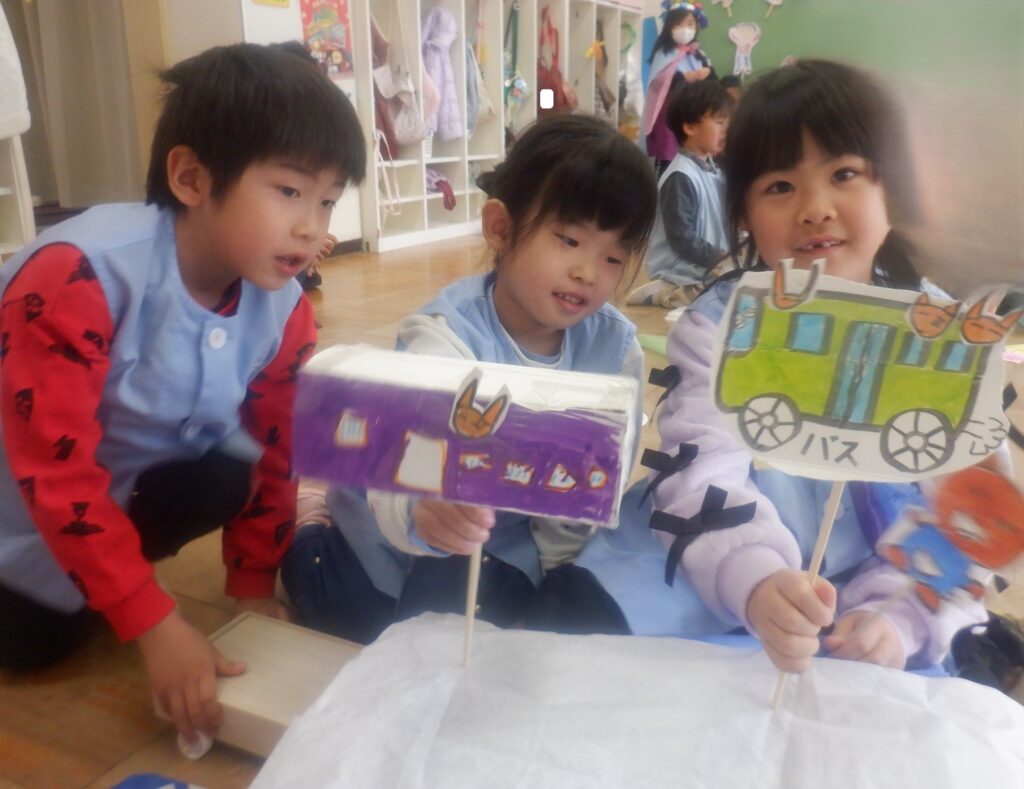 もり組のお友達は,紙や空き箱にバスの絵を描いて,ペープサートを作りました。バスに動物のお客さんを乗せて走らせています。