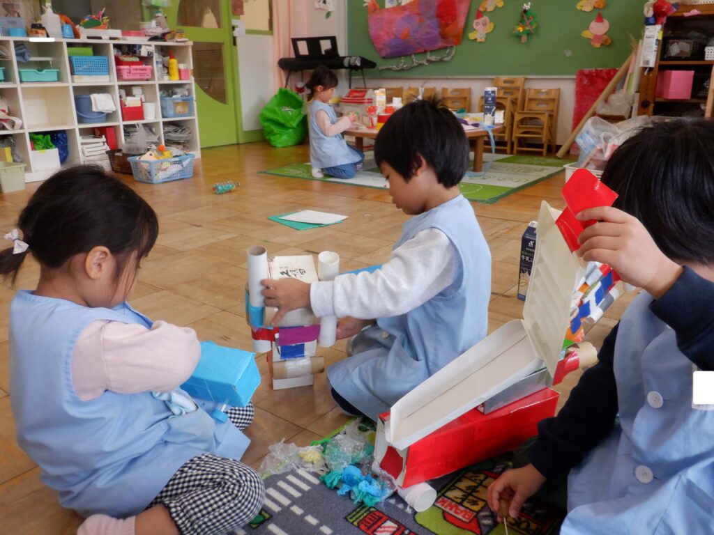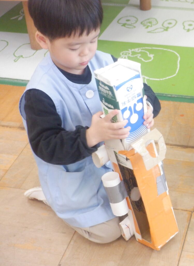 さくら組のお友達は,作りたい車のイメージに近づけたり,動く仕組みを考えたりしながら,以前から作っていた車の改良を重ねています。