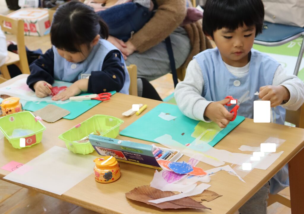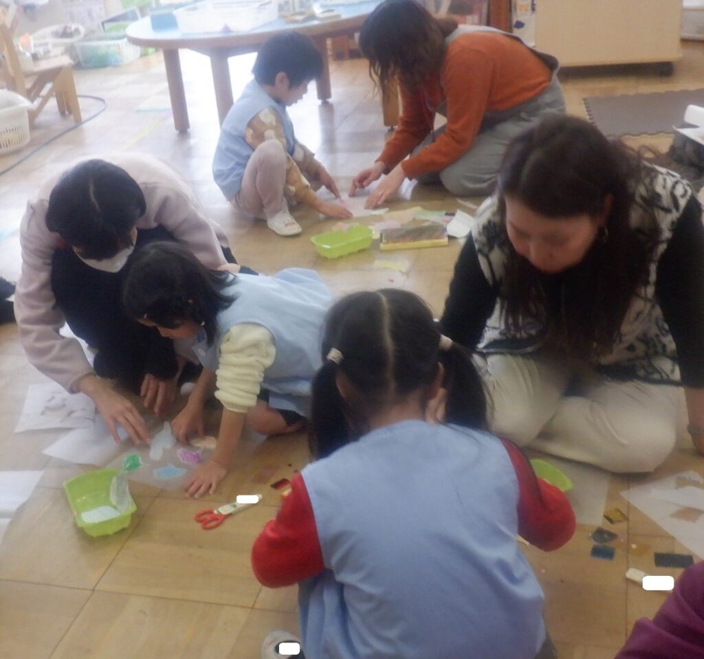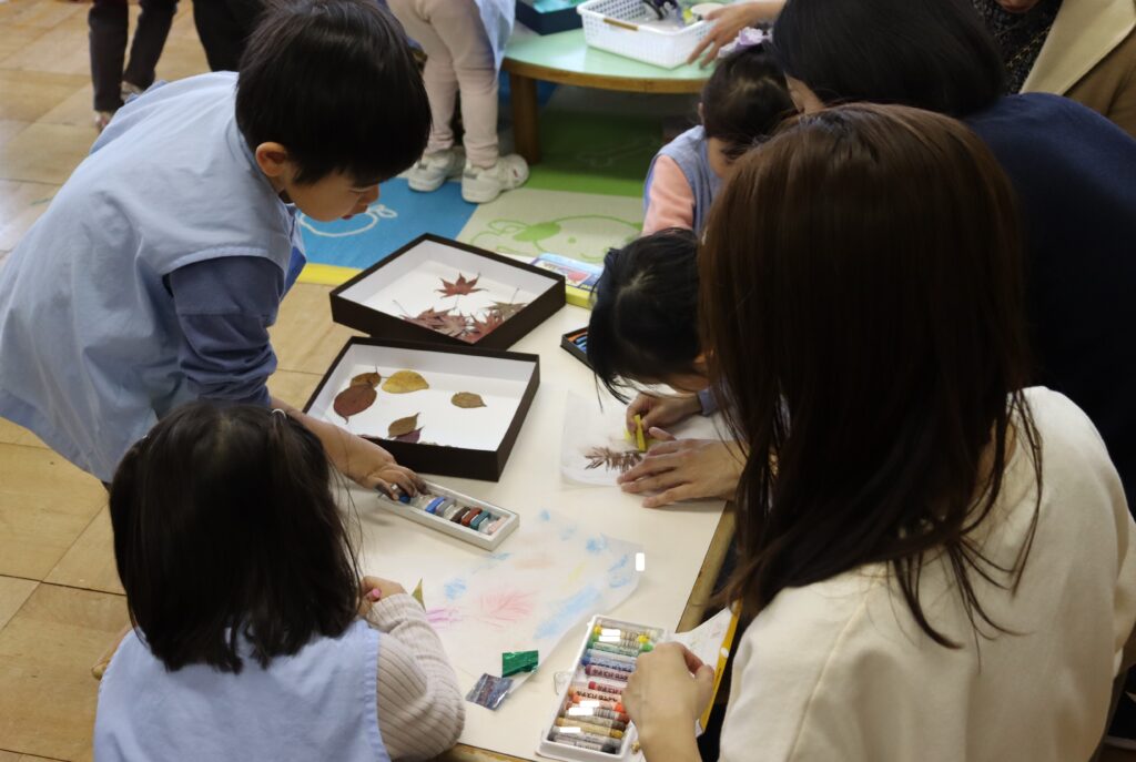 今回のテーマは,「かぞくDE作って飾ろう!ぼくたちの野外美術館~なかよし広場を素敵な美術館に変身~」です。園庭で拾った落ち葉をトレーシングペーパーにクレヨンなどで写しとったり,キラキラした折り紙やお花紙などの素材を使ったりして,生き物やオリジナルの模様をつくりました。