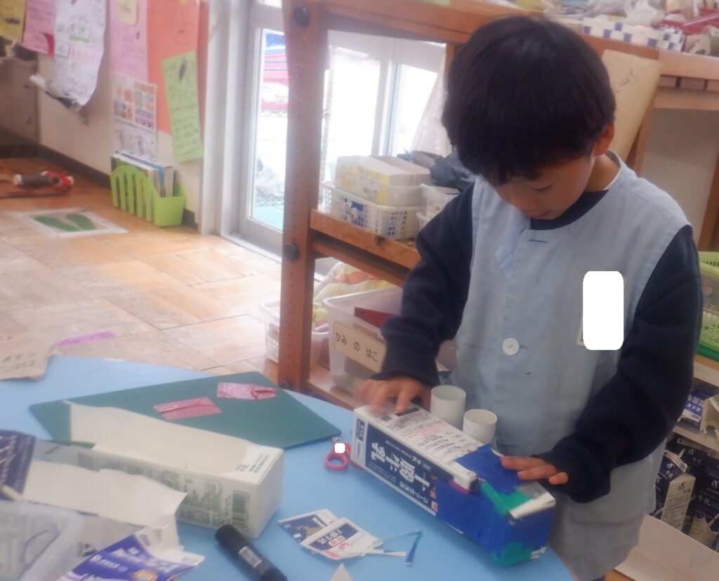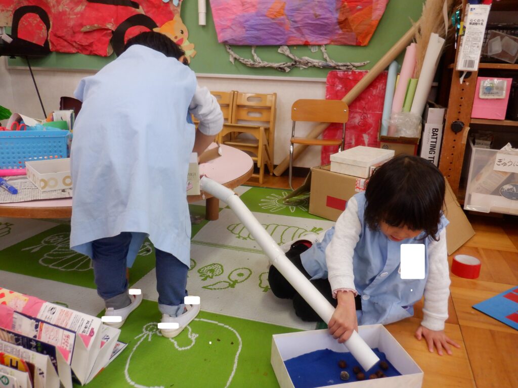 さくら組のお友達は,テーブルの上から下の箱までラップ芯をつないで,どんぐりコースターを作りました。