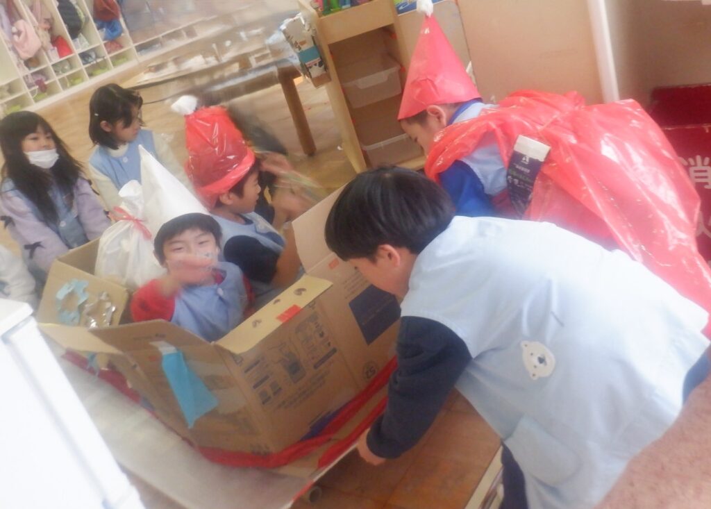もり組のお友達は,サンタさんになりきり,衣装を身に着け,鈴を鳴らしてプレゼントを届けに行きます。