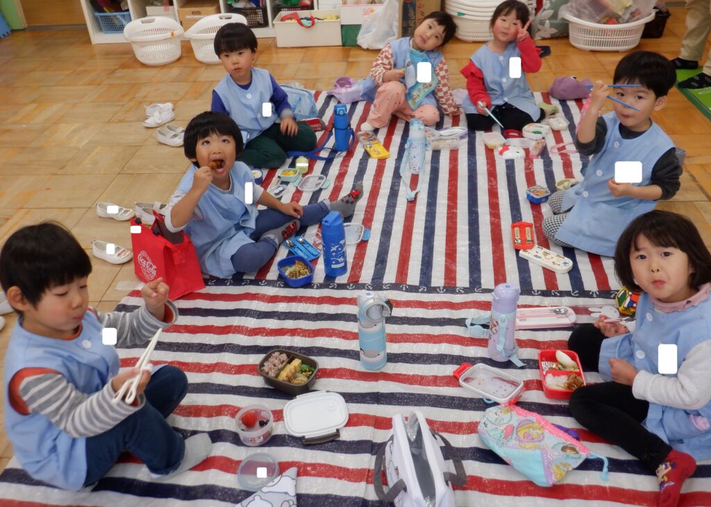 さくら組のお友達は,お部屋に敷物を敷いて,丸くなって座り,お弁当の時間です。